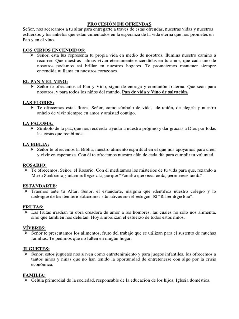 Estos serían incorporados a la procesión de ofrendas llevados por . T.bendito seas por siempre, señor. Guión de la misa de niños del domingo 2º del to. Ofrendas para la misa del divino niño. Recibe señor estas flores, con ellas queremos manifestar la alegría de nuestros corazones.